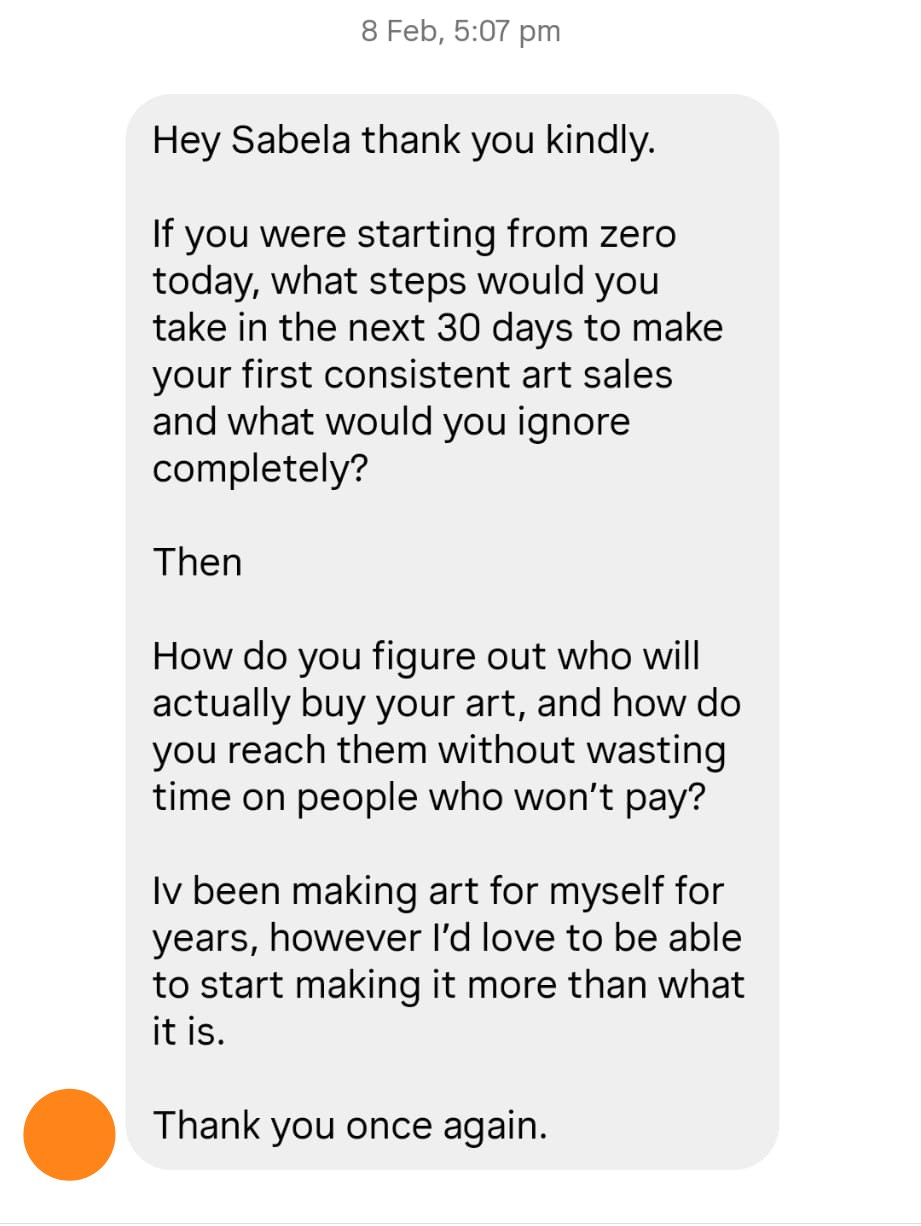 To answer the question “how to reach out to people who are interested in my art and not waste the time in people who are not going to pay” is a big deal because art is all about waisting all the time in all the people. If people resonate with your artwork (and I keep on mentioning this word again and again because I think RESONANCE is the key) they will come to you, attracted like a bee by the perfume of the flower. You will then need to figure out how to build healthy boundaries. If they buy a piece of your art it is because they want to support you and the message is so strong they want to have the reminder of what you emit closer. If this is not happening it is because a part of you is not healed, is asking for validation or is leaking energy. In this case, I recommend just working on yourself and what your art means to you because creating art should be the most radical and selfish act. And the good news is that you don’t even need to like the result yourself. Just enjoy the process of creation. That is enough.