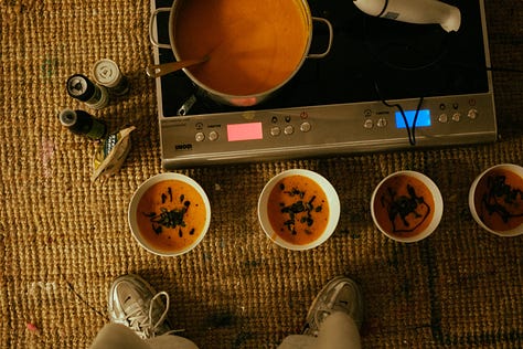 This is the scenario: One person wants to cooks and decides to make soup for everyone, another prepares a drink, someone begins something and asks for feedback and someone else does nothing at all and just chill. This way conversations unfold. Not small talk, but the kind that opens something. Often, that conversation becomes the seed for the next piece of work or for a collaboration.